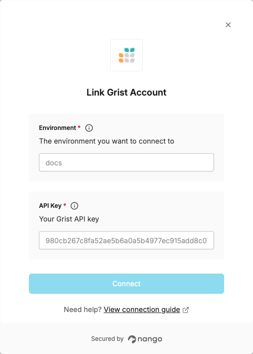 To authenticate with Grist, you need:- Environment - The environment you want to connect to (personal site or team site).