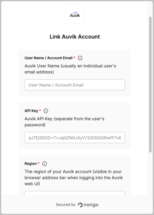3. Region – Your Auvik region (e.g., us1, us2, eu1). This determines your API base URL like https://auvikapi.<region>.my.auvik.com.