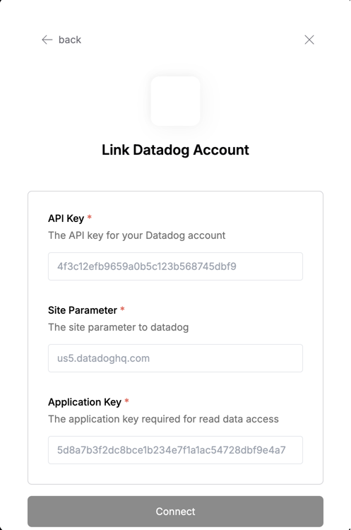 To authenticate with Datadog, you need three key pieces of information:- API Key - Your Datadog API Key