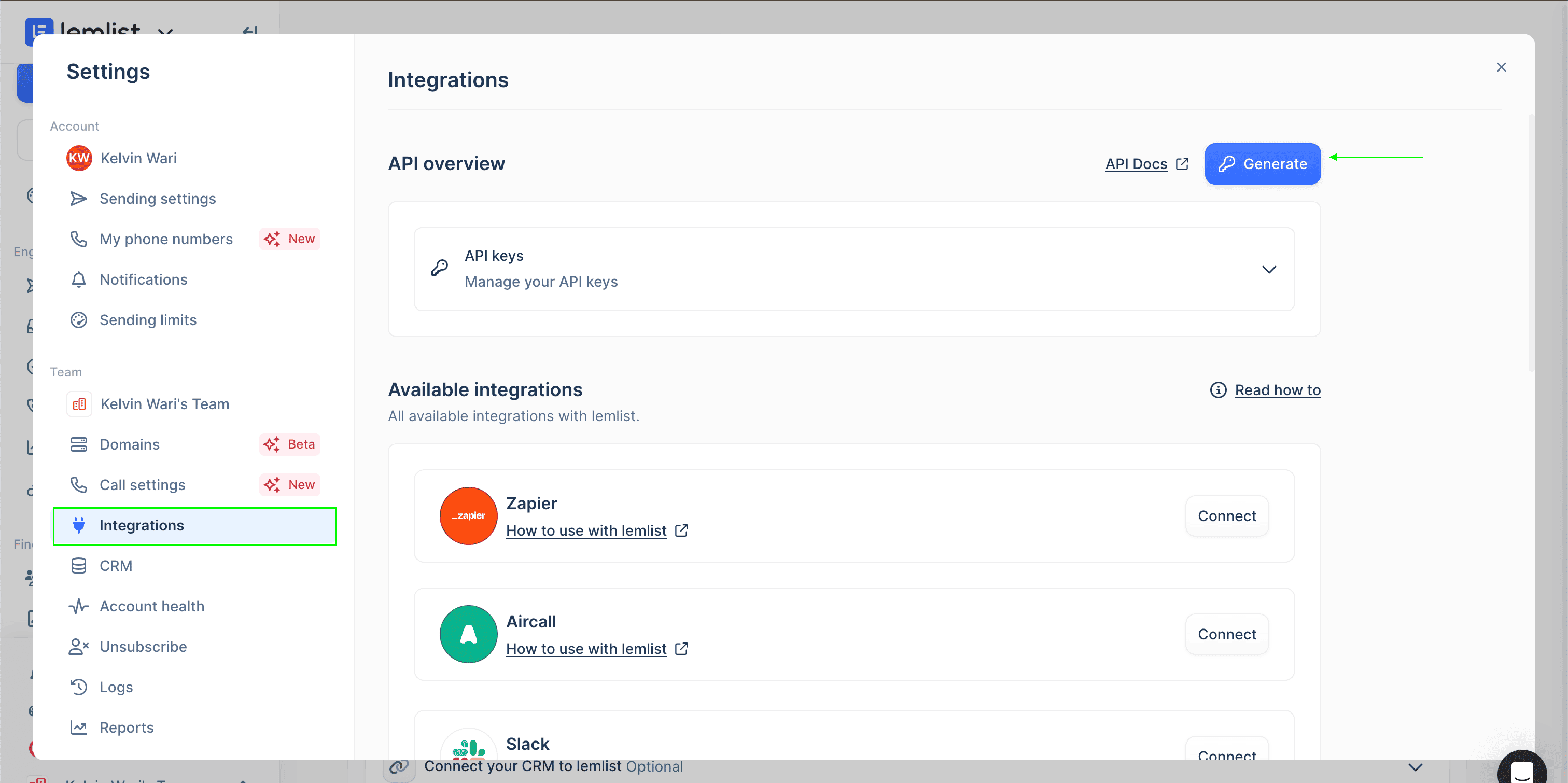 This guide will walk you through generating your API Key within lemlist.