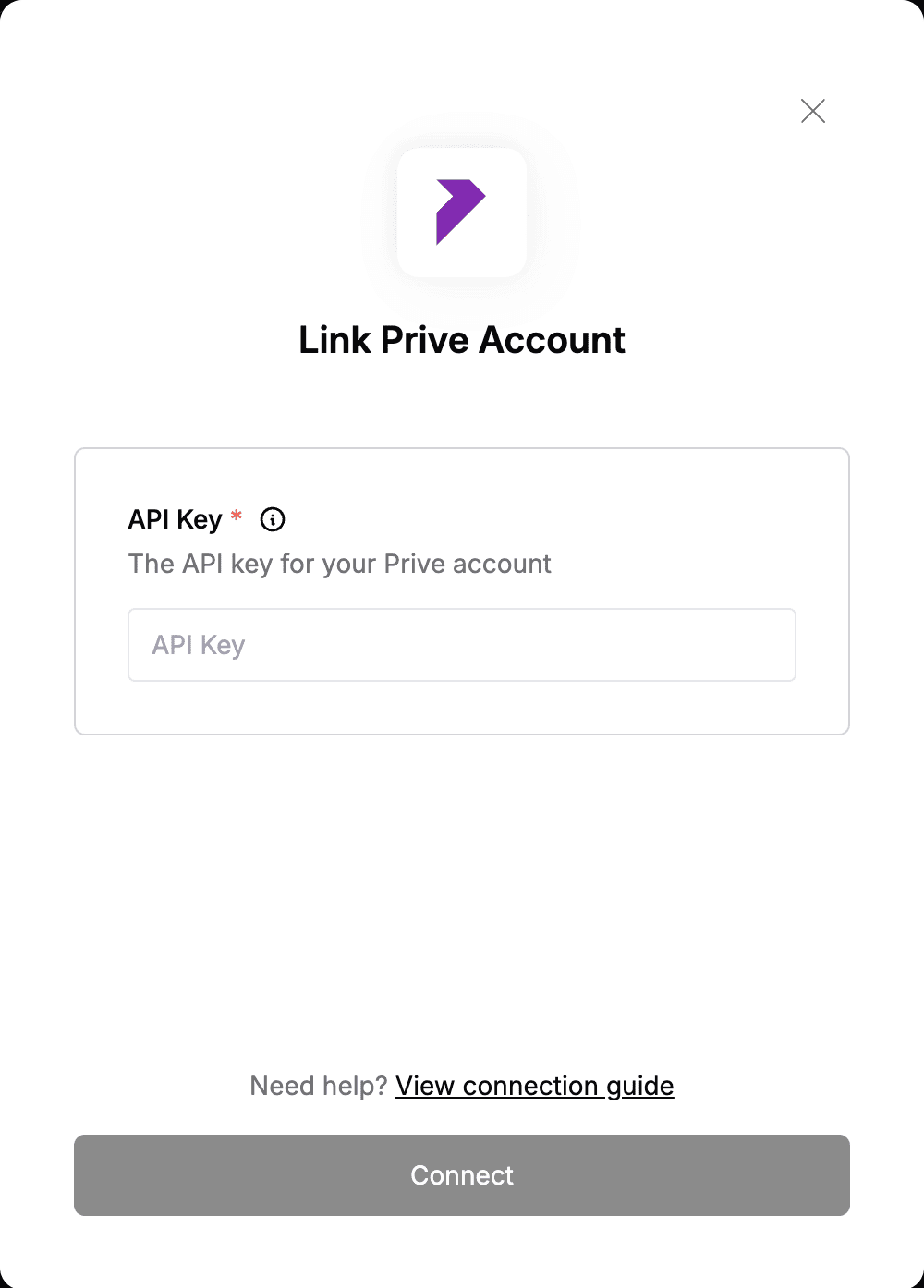 1. To request your unique Prive API Key, contact the support team via email at cs@tryprive.com or through the support section of your account dashboard.