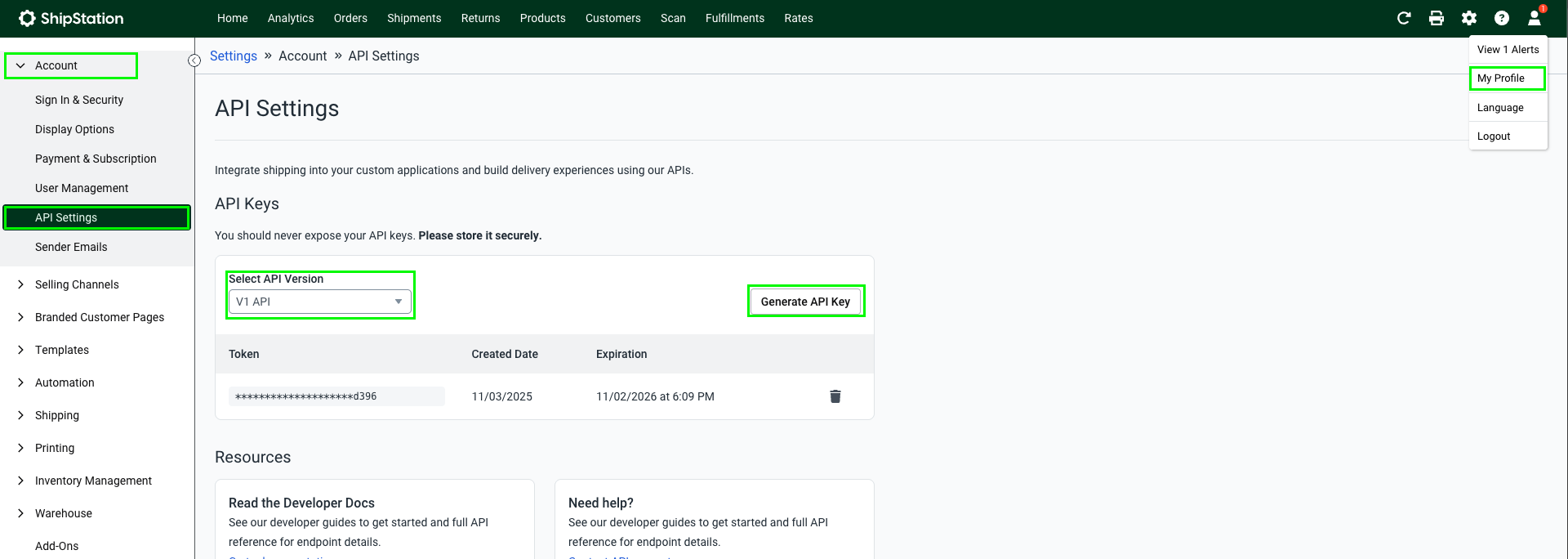 - Secret Key - Used together with your API Key to authenticate and authorize requests to the ShipStation (v1) API.